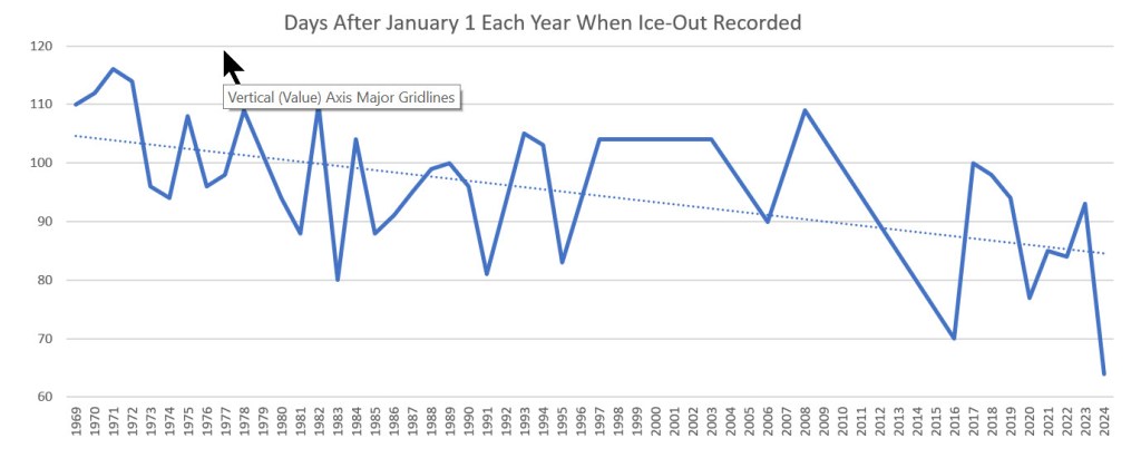 As a substitute perspective for tracking the duration of Ice-In days each year, we have created the following graph depicting the number of days between January 1st of each year and actual Ice-Out. There is a clear downward trend in this statistic.